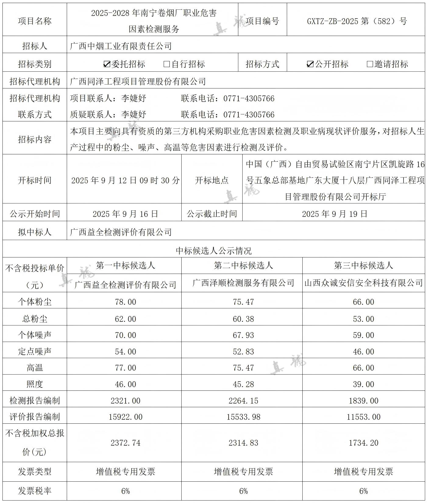 廣西中煙工業(yè)有限責(zé)任公司2025-2028年南寧卷煙廠職業(yè)危害因素檢測服務(wù)(項目編號:GXTZ-ZB-2025第(582)號)中標(biāo)候選人公示